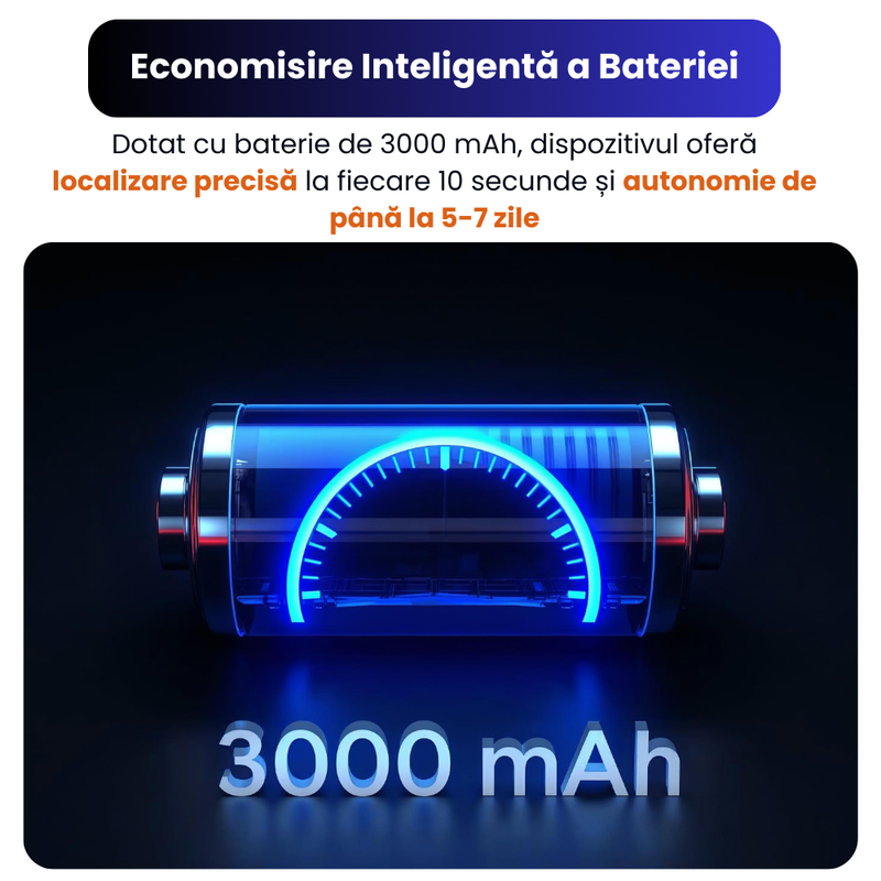 Autonomie extinsa datorita bateriei de 3000 mAh, proiectata pentru consum inteligent de energie si functionare eficienta pe termen lung. Sistemul optimizeaza automat utilizarea bateriei, oferind localizare precisa la intervale regulate si durata de functionare de pana la 5–7 zile, fara reincarcare frecventa.