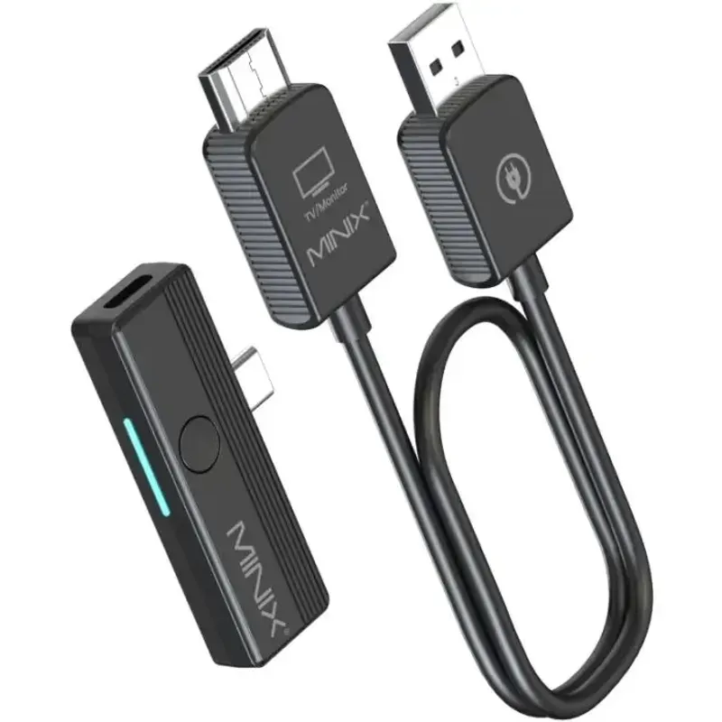 Transmitator si Receptor HDMI Wireless Minix C1 Plus Full HD 1080P USB-C max. 50m negru. HDMI wireless USB-C: Conceput pentru a se integra perfect cu portul USB-C, dongle-ul HDMI wireless C1 Plus Type C oferă o potrivire perfectă pentru iPhone 15+/Laptop/Tablete cu port USB C. Plug and Play: Cufundați-vă într-o lume a confortului cu transmițătorul și receptorul nostru wireless HDMI plug-and-play. Nu sunt necesare drivere sau aplicații - conectați-l și începeți să vă bucurați de o conexiune directă și fiabilă, fără dificultățile conectărilor Wi-Fi. Libertate wireless HDMI: Experimentați confortul conectivității HDMI wireless cu dongle-ul C1 Plus. Transmițătorul și receptorul HDMI oferă o rază generoasă de acțiune de până la 50 de metri (164 de picioare), permițându-vă să transmiteți semnale video cu ușurință și să vă îmbunătățiți experiența de conectivitate. Notă: performanța poate să nu fie la fel de bună atunci când este utilizată prin pereți. Moduri de afișare flexibile: Îmbunătățiți-vă fluxul de lucru sau divertismentul cu modurile noastre de afișare oglindă sau extinsă. Indiferent dacă trebuie să duplicați ecranul sau să extindeți desktopul, transmițătorul-receptorul HDMI wireless MINIX vă acoperă pentru o experiență mai eficientă și mai plăcută. C1 Plus necesită o intrare de minimum 5V/2A Imagini Full HD: Cufundați-vă în rezoluție full-definition la o frecvență fluidă de 60Hz cu conexiunea noastră de 2.4G/5GHz. Experimentați imagini clare și vibrante, perfecte pentru jocuri, streaming și orice conținut care necesită afișare de înaltă calitate.