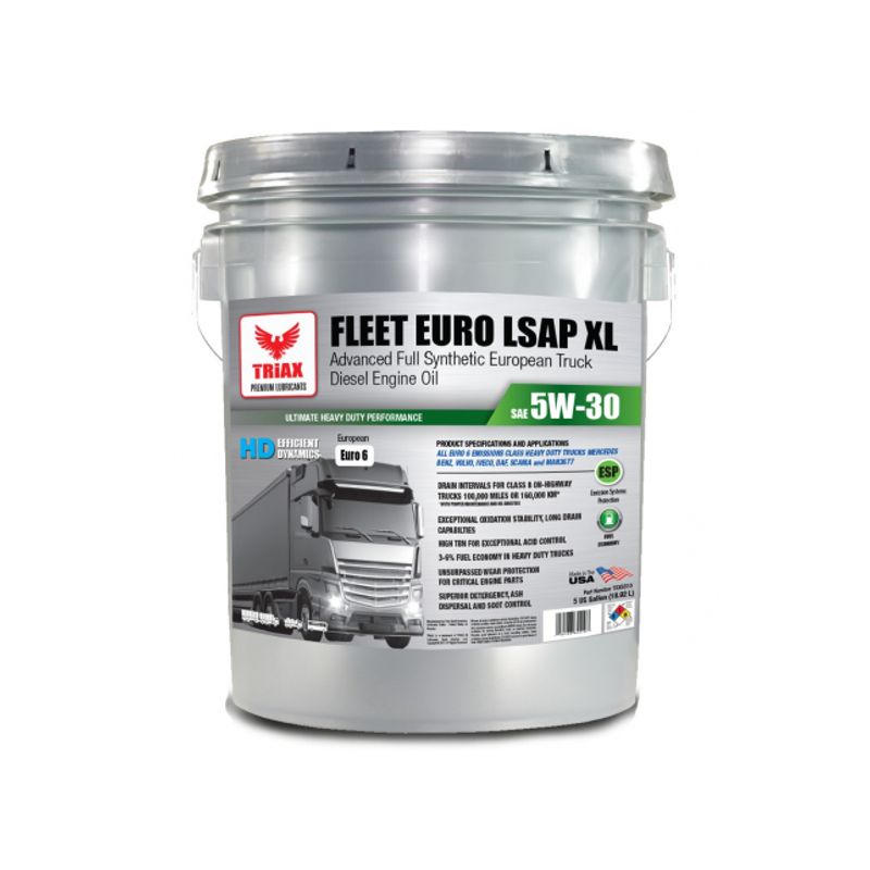 TRIAX Fleet Euro LSAP XL 5W-30 reprezinta varful tehnologic in domeniul lubrifiantilor si viitorul lubrifiantilor “next generation”. Formularea full sintetica din Polyalphaolephins (PAO), cu ultima generatie de aditivi pentru intervale de schimb foarte lungi, capabil de peste 130,000 de km, oferind protectie si performanta exemplara. Foarte putine produse in lume pot echivala performanta acestui produs. Acest produs utilizeaza ultima tehnologie in domeniul aditivilor si a uleiurilor de baza, pentru a facilita rentabilitatea exceptionala. Este recomandat pentru o gama foarte extinsa de echipamente si utilaje, inclusiv ultima generatie de motoare diesel, Nord Americane si Europene, Heavy-Duty Diesel Engines, inclusiv Euro 6 si Euro 5 si US EPA 2007/2010 Modern Low Emissions Vehicles, utilizand tehnologii precum Diesel Particulate Filter (DPF), Selective Catalytic Reduction (SCR), Continuously Regenerating Traps (CRT), Diesel Oxidation Catalysts (DOC) si Exhaust Gas Recirculation (EGR).