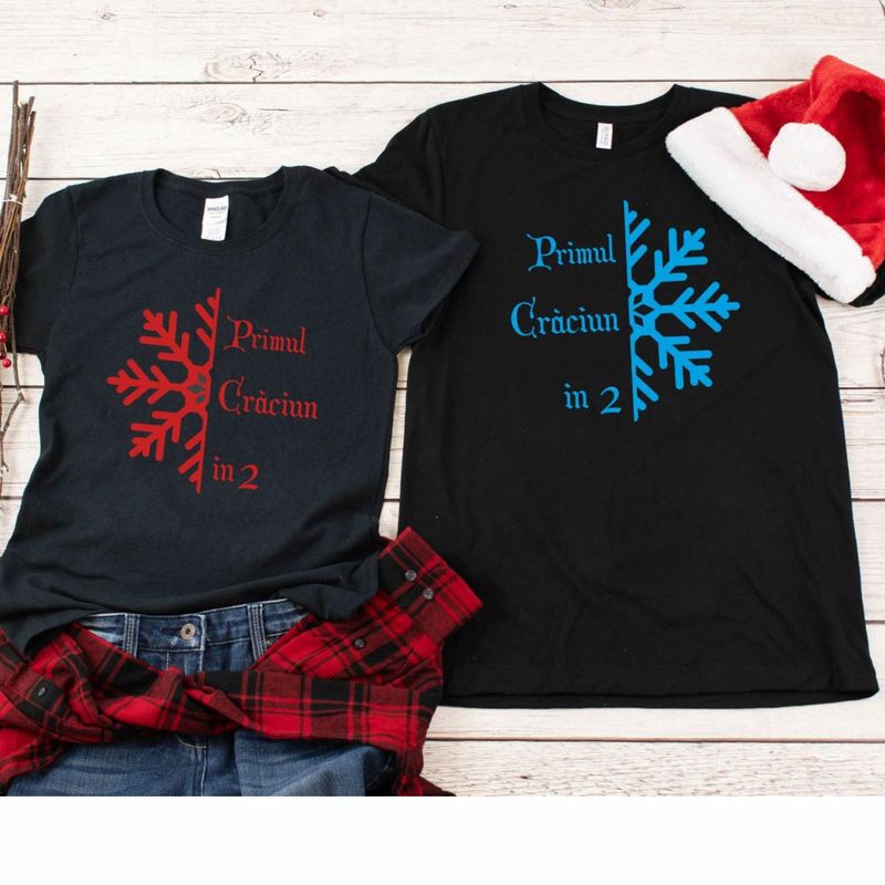 Tricouri de Craciun, de cuplu, negre, 100% bumbac, "Primul Craciun in 2" Tricouri de Craciun, de cuplu, negre, 100% bumbac, "Primul Craciun in 2"