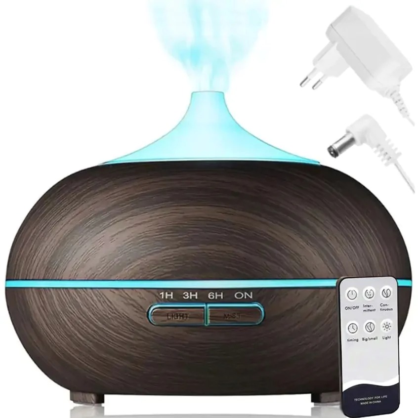 Umidificator de aer cu difuzor aroma, 300 ml, ionizator, ultrasunete, iluminare LED, telecomanda, maro inchis