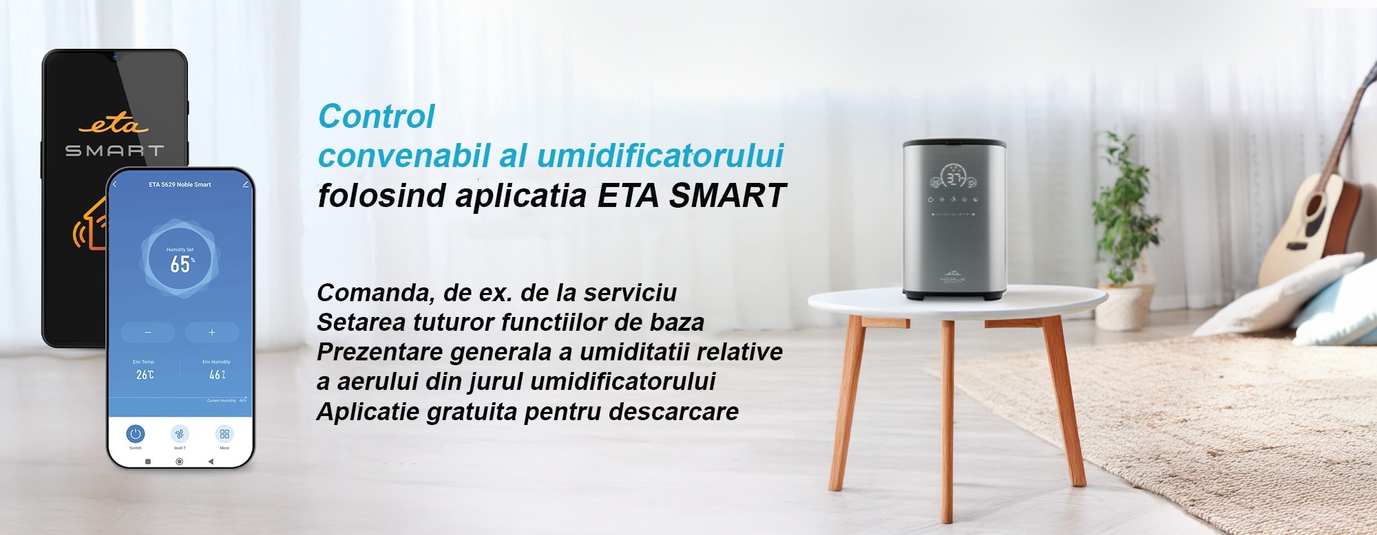 Umidificatorul ETA Noble Smart poate fi controlat in trei moduri: direct de pe panoul tactil al aparatului, cu ajutorul telecomenzii pentru confort maxim sau de la distanta prin aplicatia inteligenta ETA SMART. Aplicatia este disponibila gratuit (in limba engleza) si iti permite nu doar sa setezi functiile aparatului, ci si sa monitorizezi in timp real umiditatea si temperatura din incapere chiar si atunci cand esti plecat de acasa.