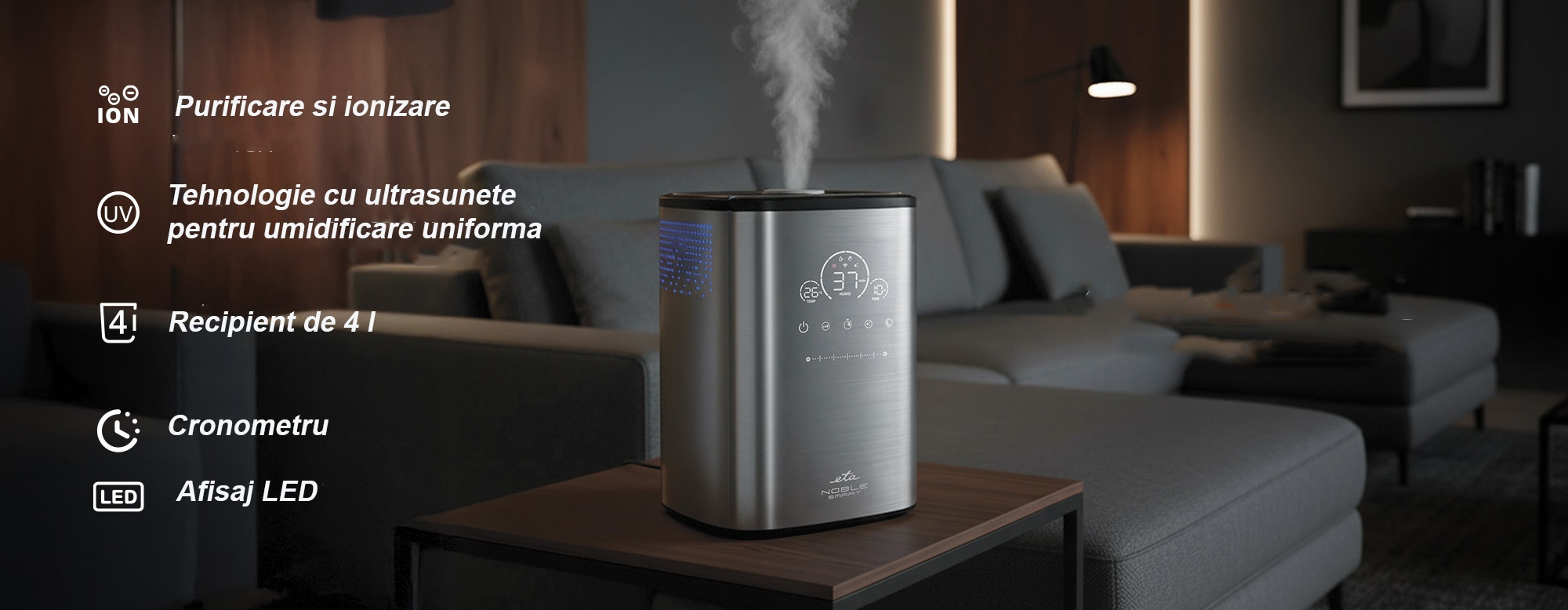 ETA Noble Smart 5629 este alegerea ideala daca iti doresti un aer mai curat, o umiditate optima si control inteligent intr-un singur aparat modern si elegant. Perfect pentru familii cu copii sau persoane sensibile, acest umidificator transforma orice locuinta intr-un spatiu mai sanatos si mai confortabil.