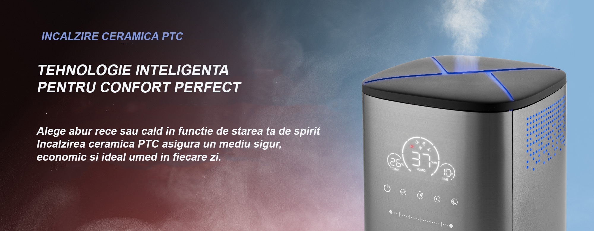 Modul AUTO mentine nivelul optim de umiditate in functie de temperatura din incapere, eliminand necesitatea setarilor manuale. Poti alege intre abur rece sau abur cald, acesta din urma fiind generat prin tehnologia PTC cu incalzire ceramica, sigura si eficienta energetic. Sistemul se autoregleaza si protejeaza aparatul impotriva supraincalzirii.