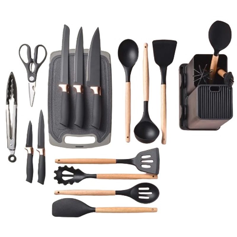 Descoperă setul complet de 19 ustensile de bucătărie, creat pentru a transforma orice experiență culinară intr-o plăcere. Acest set premium combină funcționalitatea cu un design elegant, fiind realizat din silicon alimentar de inaltă calitate și lemn durabil. Ideal pentru bucătarii amatori și profesioniști deopotrivă, acest set te ajută să gătești cu ușurință și stil.