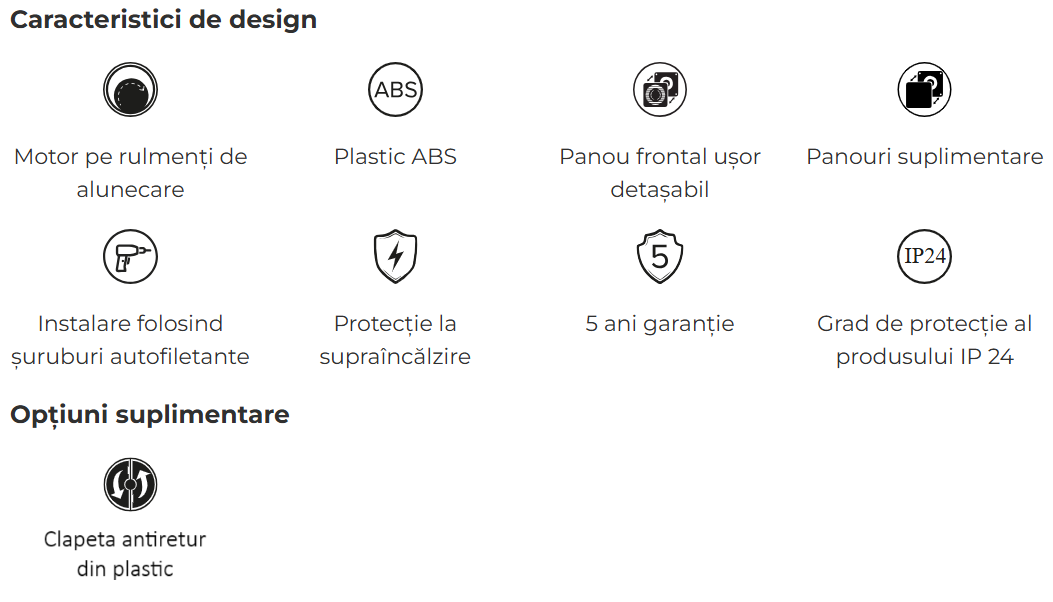 - Potrivit pentru ventilatia constanta sau periodica a bailor, bucatariilor, dusurilor si altor spatii casnice