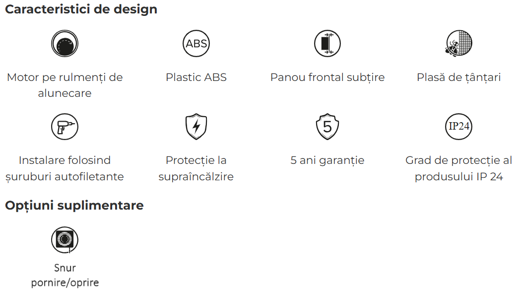 Gradul de protectie IP24 permite utilizarea ventilatorului in incaperi cu umiditate ridicata, cum sunt baile sau bucatariile. Instalarea se realizeaza rapid cu ajutorul suruburilor incluse si al kitului de montaj. Produsul este certificat conform standardului EN 60335-2-80 si beneficiaza de garantie extinsa de 5 ani.