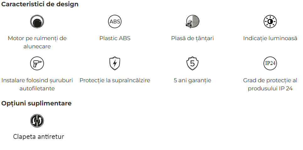 - Caracteristici constructive: garantie 5 ani, plastic ABS, montaj cu suruburi autofiletante, indicator luminos, plasa anti-insecte, motor pe bucsa, protectie la supraincalzire, grad de protectie IP24