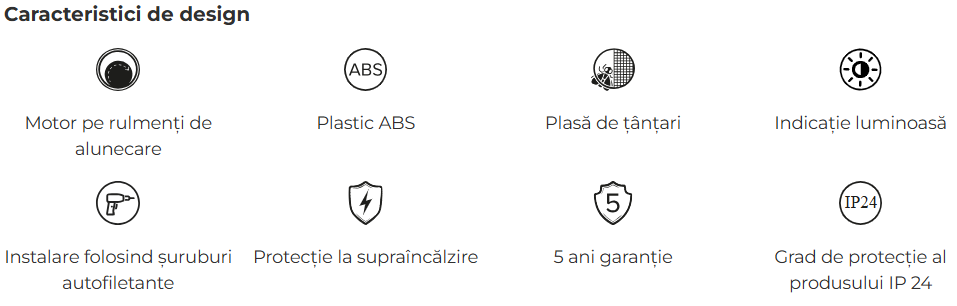 Carcasa si rotorul sunt fabricate din plastic ABS de inalta calitate, rezistent la umezeala, coroziune si raze UV, ceea ce garanteaza durabilitate pe termen lung. Toate modelele sunt echipate cu plasa anti-insecte si indicator luminos pe panoul frontal, care semnalizeaza functionarea.