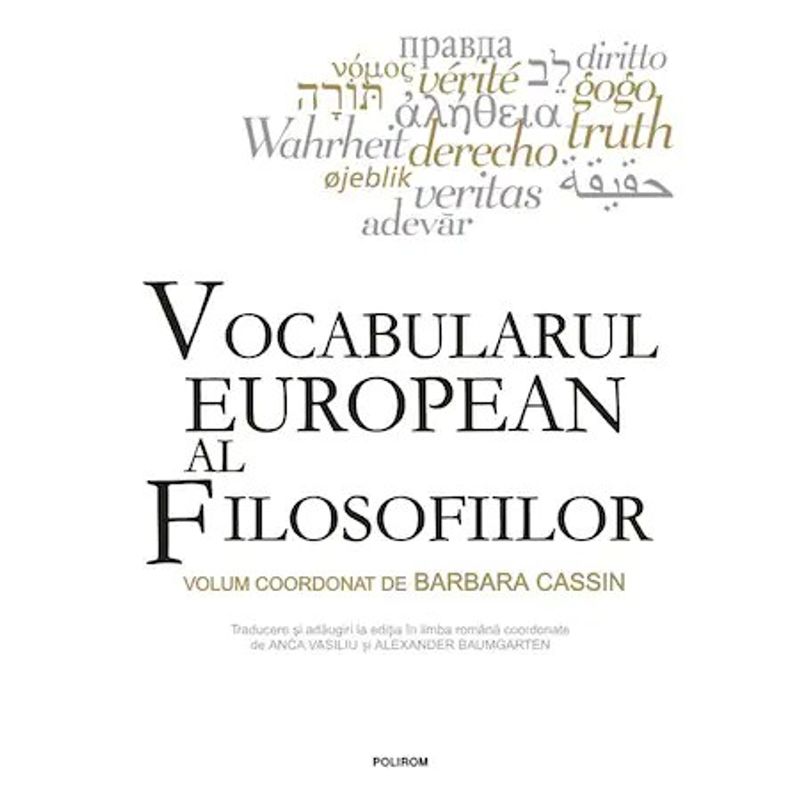 „Fata de editia originala, volumul tradus in limba romana cuprinde in plus articole si note complementare specifice vocabularului filosofic romanesc, redactate in spiritul dictionarului conceput de Barbara Cassin. Pe de o parte sunt articole de sinteza cu intrare proprie, precum «Romana (limba)» sau «Vocabularul filosofic romanesc». Acestea sunt echivalente articolelor de fond din dictionarul original, care propun o viziune istorica si lingvistica asupra limbii si creatiei unui lexic filosofic. Pe de alta parte, exista numeroase inserturi de note, uneori mici articole, toate insotite de referinte bibliografice, care extind aria lexicului existent in editia originala catre vocabularul romanesc si catre filosofi romani precum Lucian Blaga sau Constantin Noica, care au creat la randul lor un vocabular, un limbaj filosofic si un mod de a filosofa in orizontul limbii romane.” (Anca Vasiliu, Alexander Baumgarten)