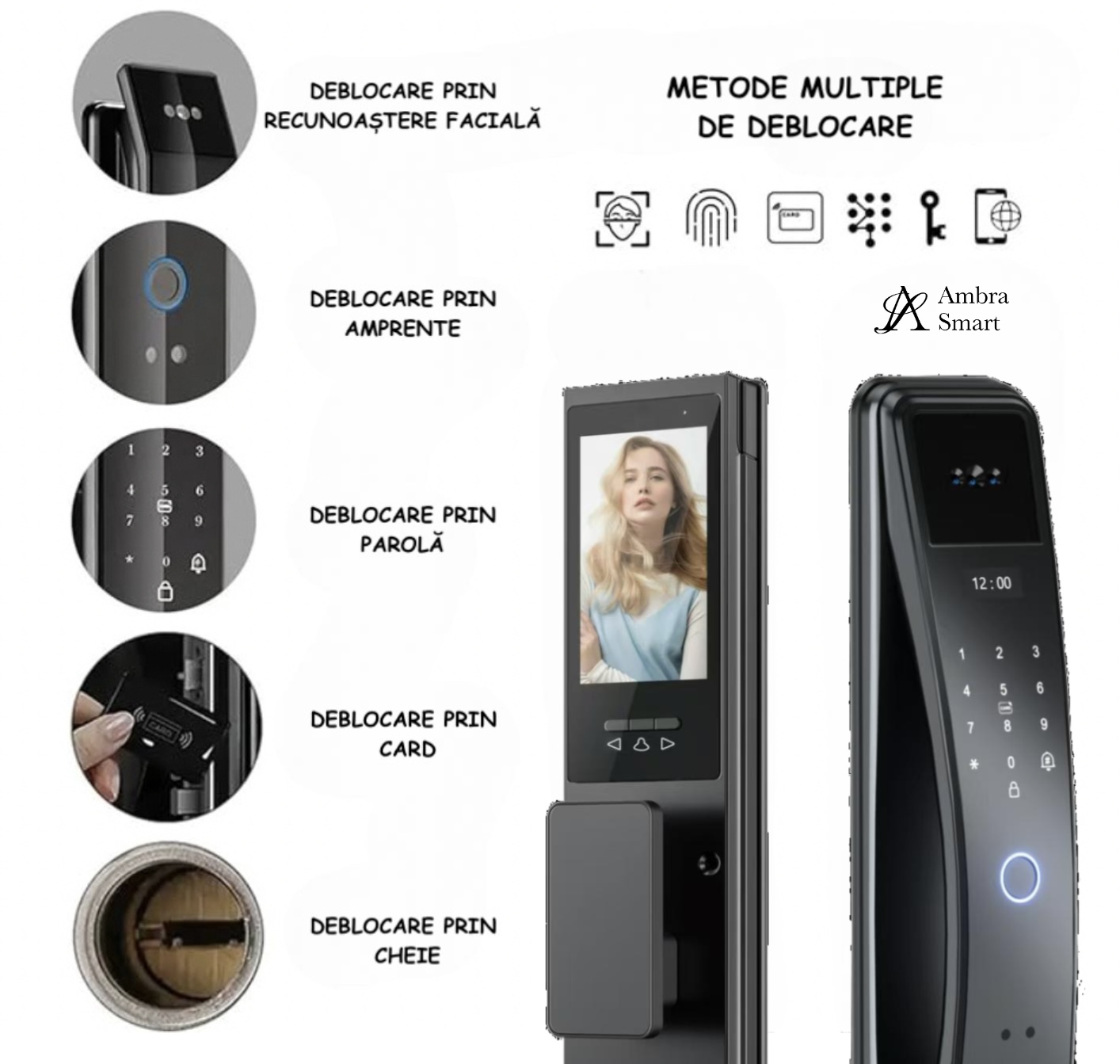 Descopera tehnologia avansata oferita de Incuietoarea Inteligenta ambrasmart, creata pentru a combina siguranta, confortul si inovatia intr-un singur dispozitiv de inalta calitate. Aceasta incorporeaza functii inteligente precum recunoastere faciala 3D, interfon video cu control de la distanta si deblocare multipla, oferind o experienta completa si adaptabila nevoilor tale.