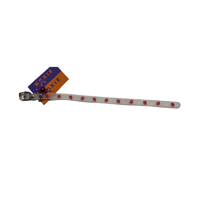 Zgarda fosforescenta pentru caini si pisici, 27 cm, silicon si metal, clopotel, rosu/transparent